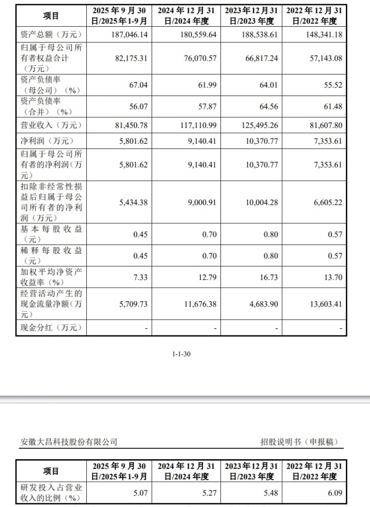 报告期内(2022年至2025年三季度),大昌科技的营业收入分别为8.16亿元、12.55亿元、11.71亿元、8.15亿元;净利润分别为7353.61万元、1.04亿元、9140.41万元、5801.62万元。